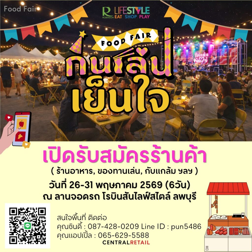 เตรียมคึกคักอีกครั้งกับงาน “กินเล่น เย็นใจ” ที่ลานปูน โรบินสันไลฟ์สไตล์ ลพบุรี ระหว่างวันที่ 26 – 31 พฤษภาคม 2569 รวมร้านอาหารชื่อดังจากทั่วประเทศ พร้อมคอนเสิร์ตและลานเบียร์ครบวงจร เปิดโอกาสพ่อค้าแม่ค้าจองพื้นที่ขาย สร้างรายได้ท่ามกลางทำเลศักยภาพใจกลางเมือง