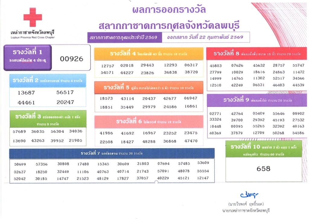 ผู้ถูกรางวัลสามารถติดต่อรับของรางวัลได้ที่สำนักงานเหล่ากาชาดจังหวัดลพบุรี พร้อมสลากฉบับจริงและบัตรประชาชนตัวจริง ตั้งแต่วันที่ 23 กุมภาพันธ์ – 30 เมษายน 2569 (เว้นวันหยุดราชการ) เวลา 08.30–16.30 น. โทร. 036-770007